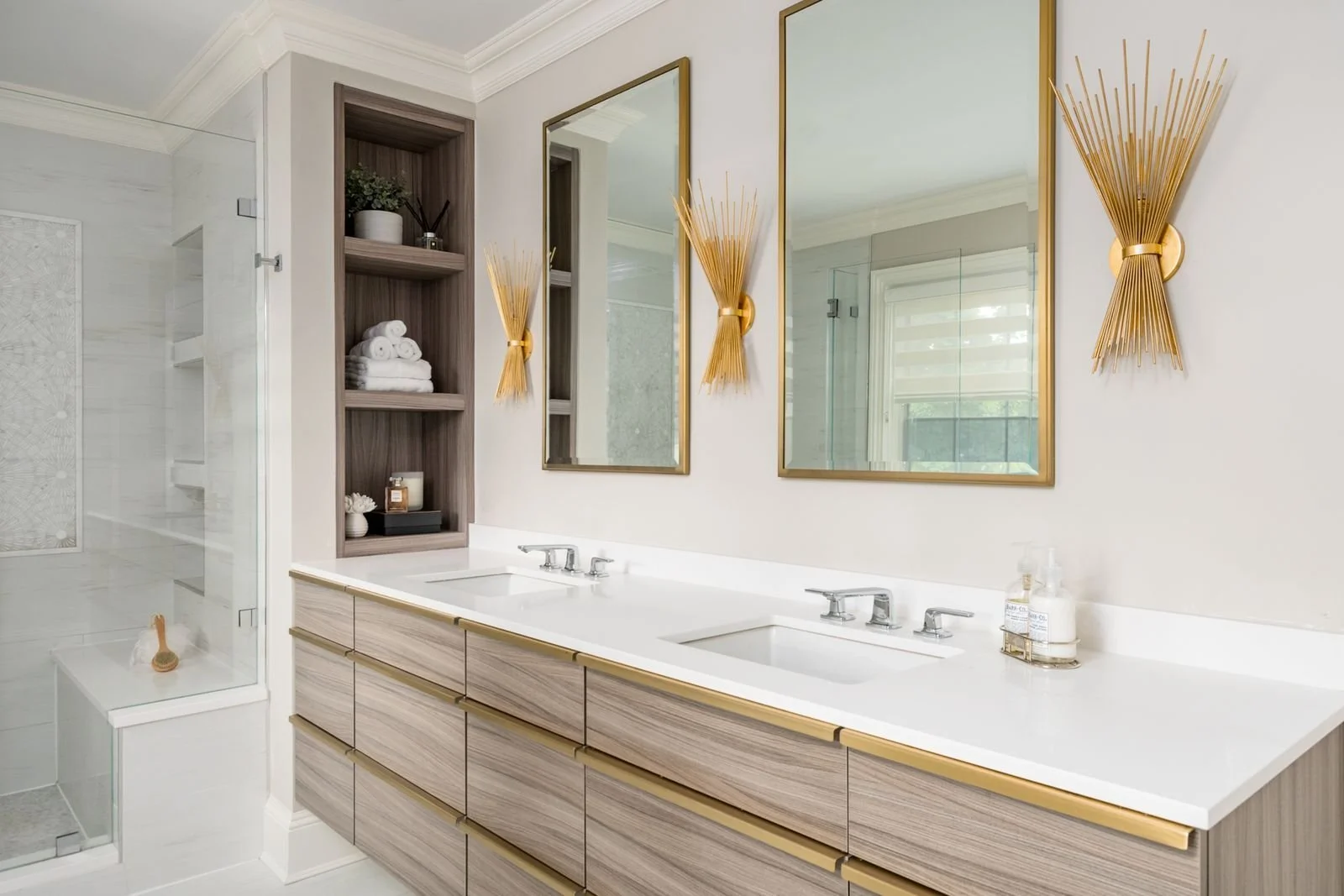 A clutter-free bathroom instantly feels more luxurious. Floating vanities, recessed shelving, and built-in niches keep daily essentials out of sight while maintaining easy access.